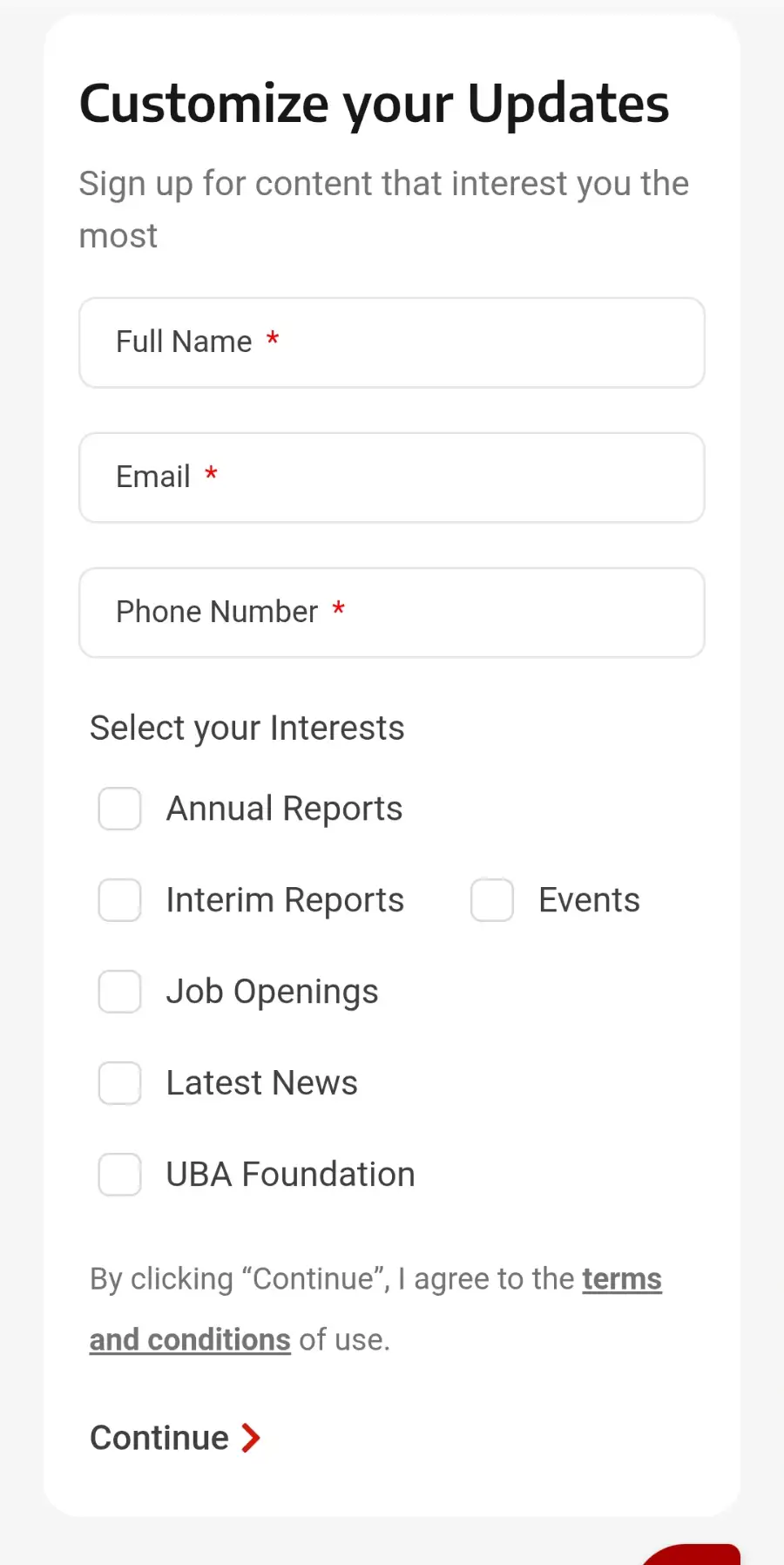 • if bank recruitment is currently closed, scroll down to the section “customize your updates” and fill in your name and email and choose interest “Job Openings” and click on “continue” to complete your submission so that you will receive and Email immediately the bank job application form is available ✅.